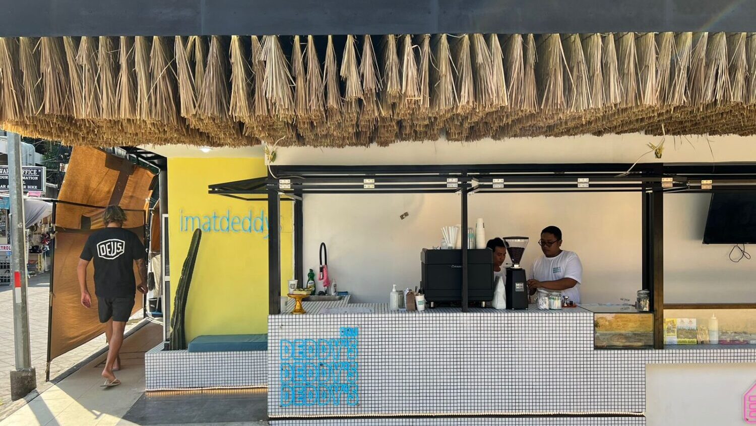Located in Kuta’s central tourist hub, Deddy’s comprises a tour office, cell shop, and a captivating coffee shop as its prime frontage to the main street. These three functions ingeniously fit within a confined space of under 10m². The challenge was twofold: crafting a layout that seamlessly accommodates circulation, storage, and visual appeal while remaining functional for daily use. This limitation, however, birthed its distinctiveness. Adorned with chic modern white mosaic tiles accented by tropical vibes, the entire space exudes a unique charm.